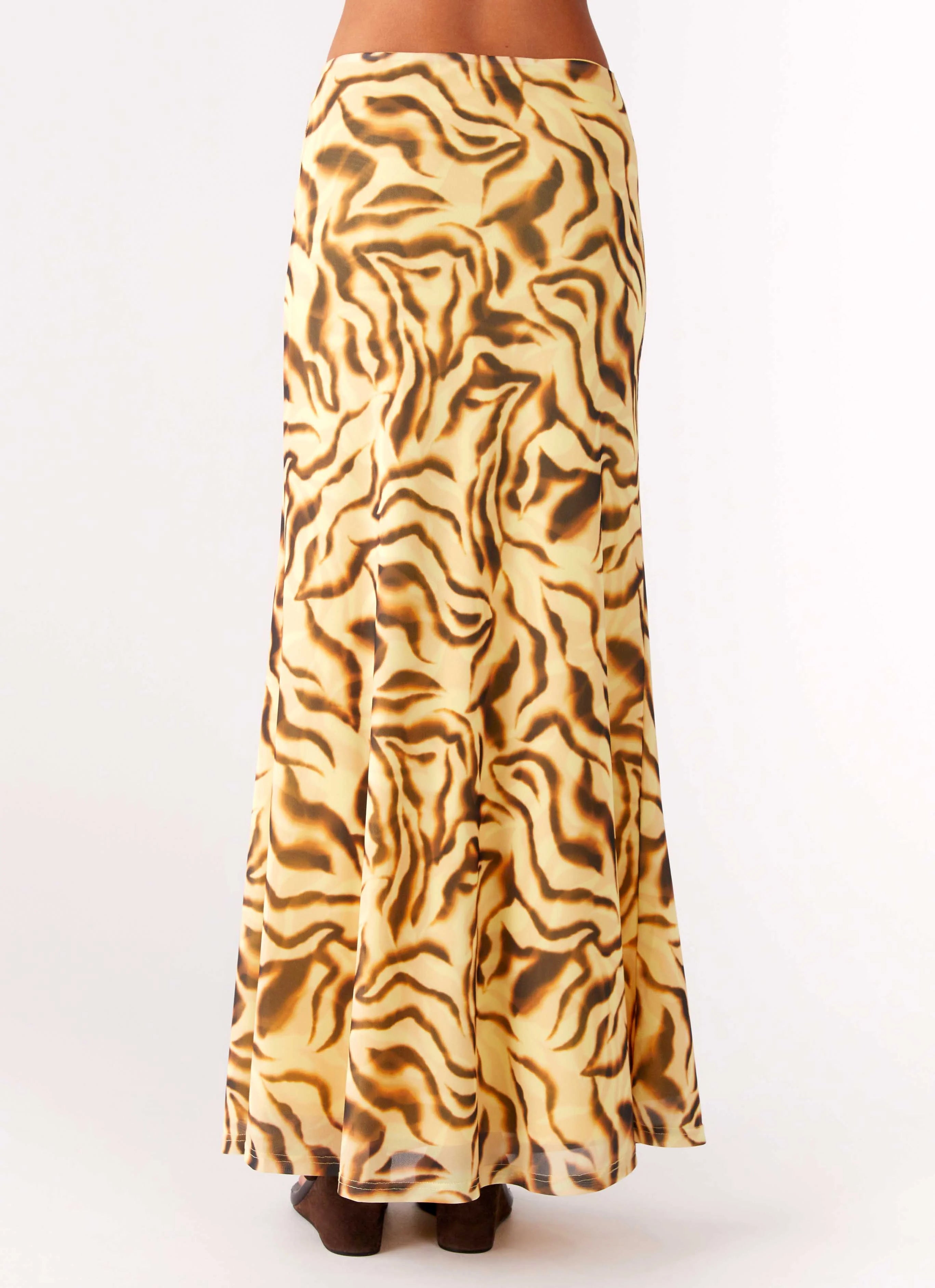 The Call Me Low Rise Maxi Skirt is made for balmy nights and bold moves. Featuring a low rise and elasticated waistband, this stretch mesh skirt is fully lined and cut in an exclusive yellow zebra print that brings the drama.