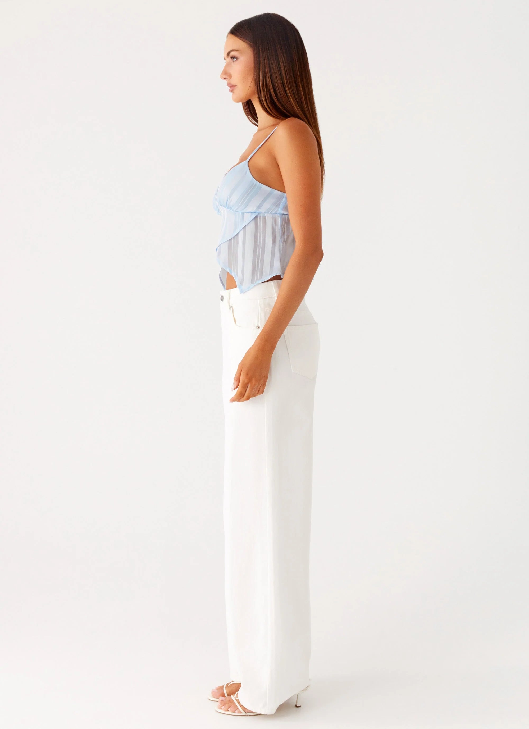 The Glynne Frill Top is a dreamy, feminine piece perfect for day-to-night styling. Featuring a flattering V neckline with adjustable straps and a fold-over frill detail, this top is crafted from sheer fabric and fully lined for comfort, it’s the perfect balance of chic and playful.