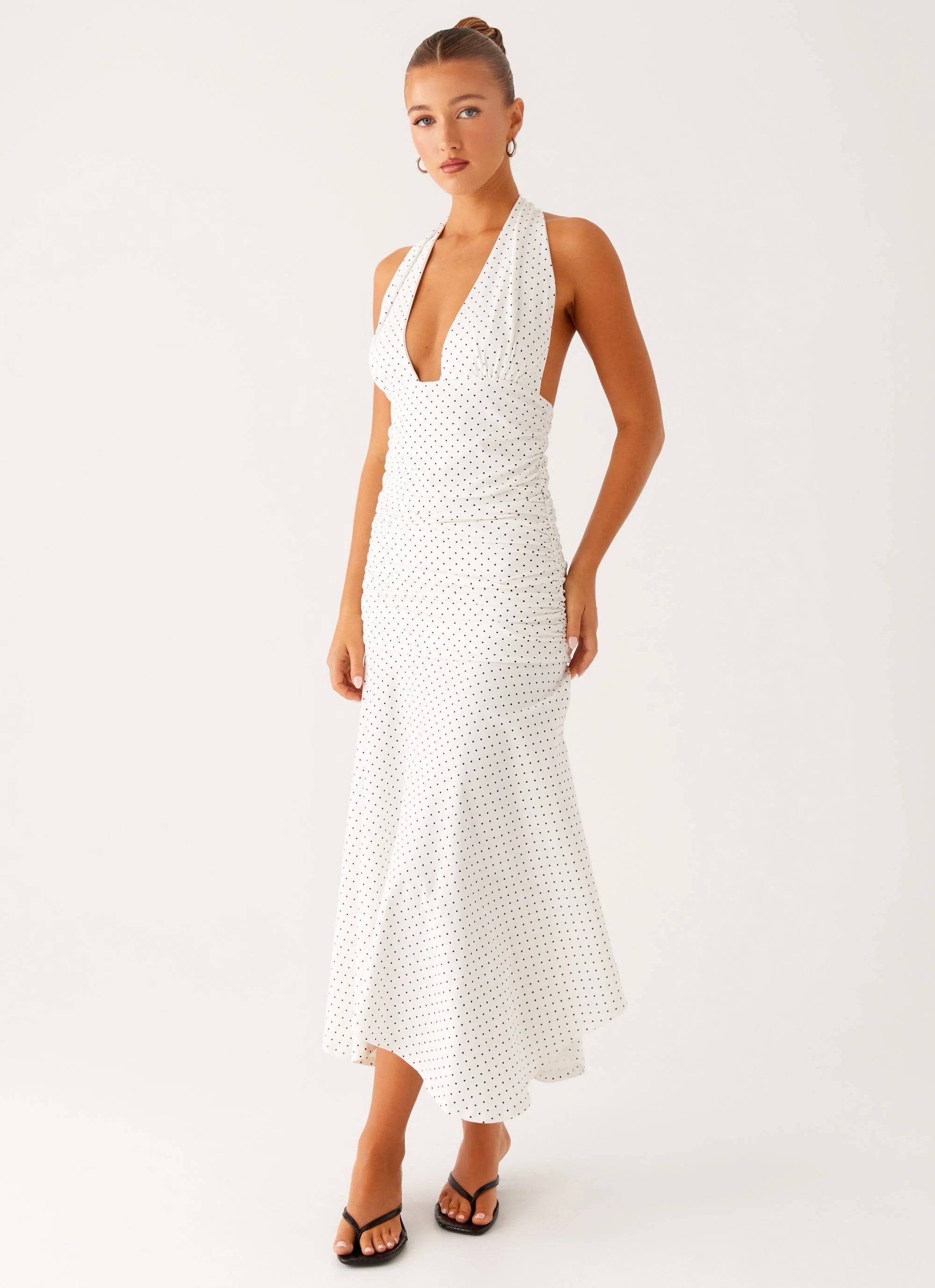 Step into the night with the Grettana Halter Neck Midi Dress, featuring a V neckline, thin neck tie strap, low back, and ruched sides. Crafted from stretch jersey for a silhouette that moves with you from golden skies to after-dark vibes.