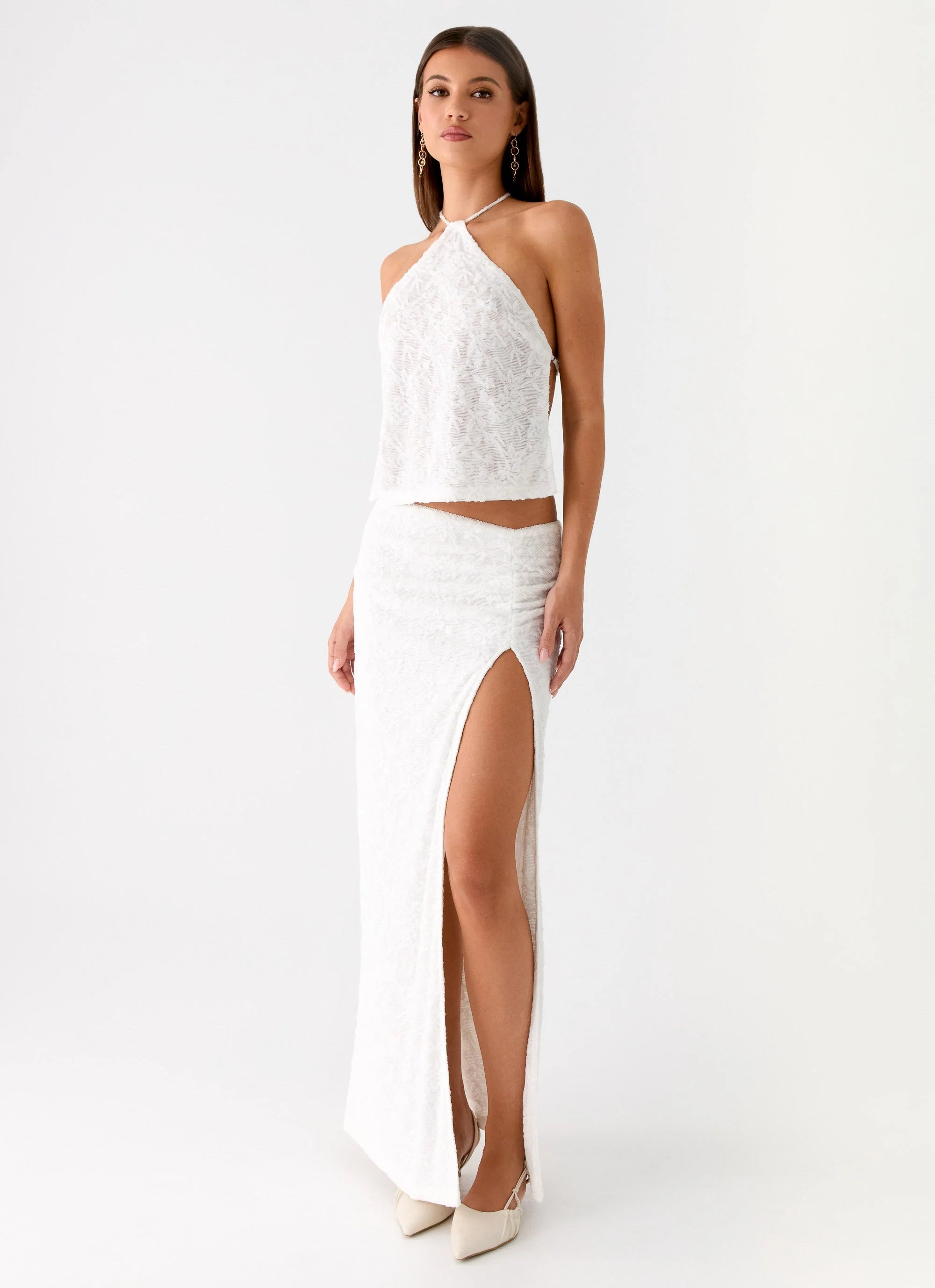 The Griff Low Rise Jacquard Maxi Skirt is made for golden hour strolls and late-night soirées. Sitting low on the waist, this fully lined silhouette features side ruching and a high slit for effortless movement. Crafted in stretch jersey, it’s a statement piece that balances comfort and after-dark glamour.