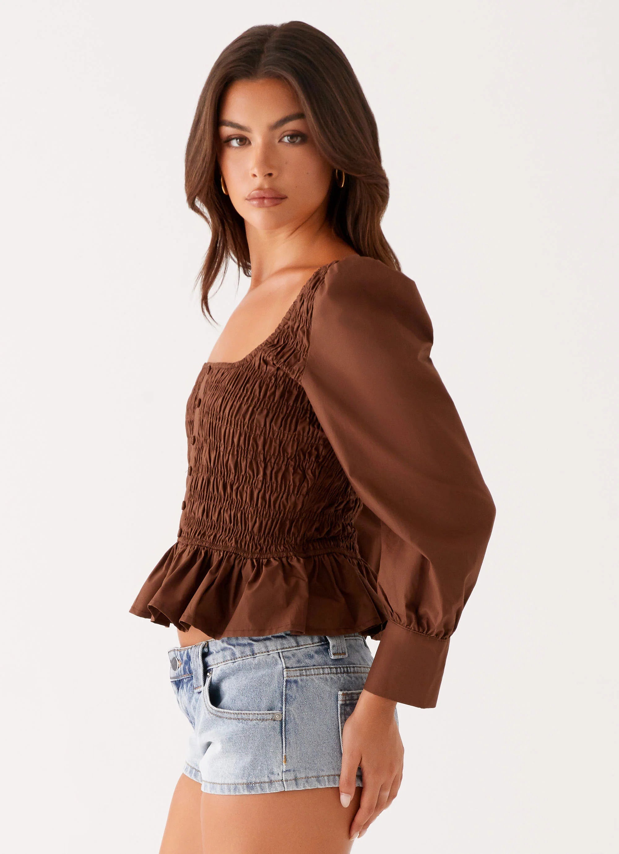 The Joyce Long Sleeve Shirred Top combines vintage-inspired charm with modern sophistication. Featuring a flattering square neckline and faux button-up detail, this top offers a fitted, shirred design that hugs the body for a feminine silhouette.