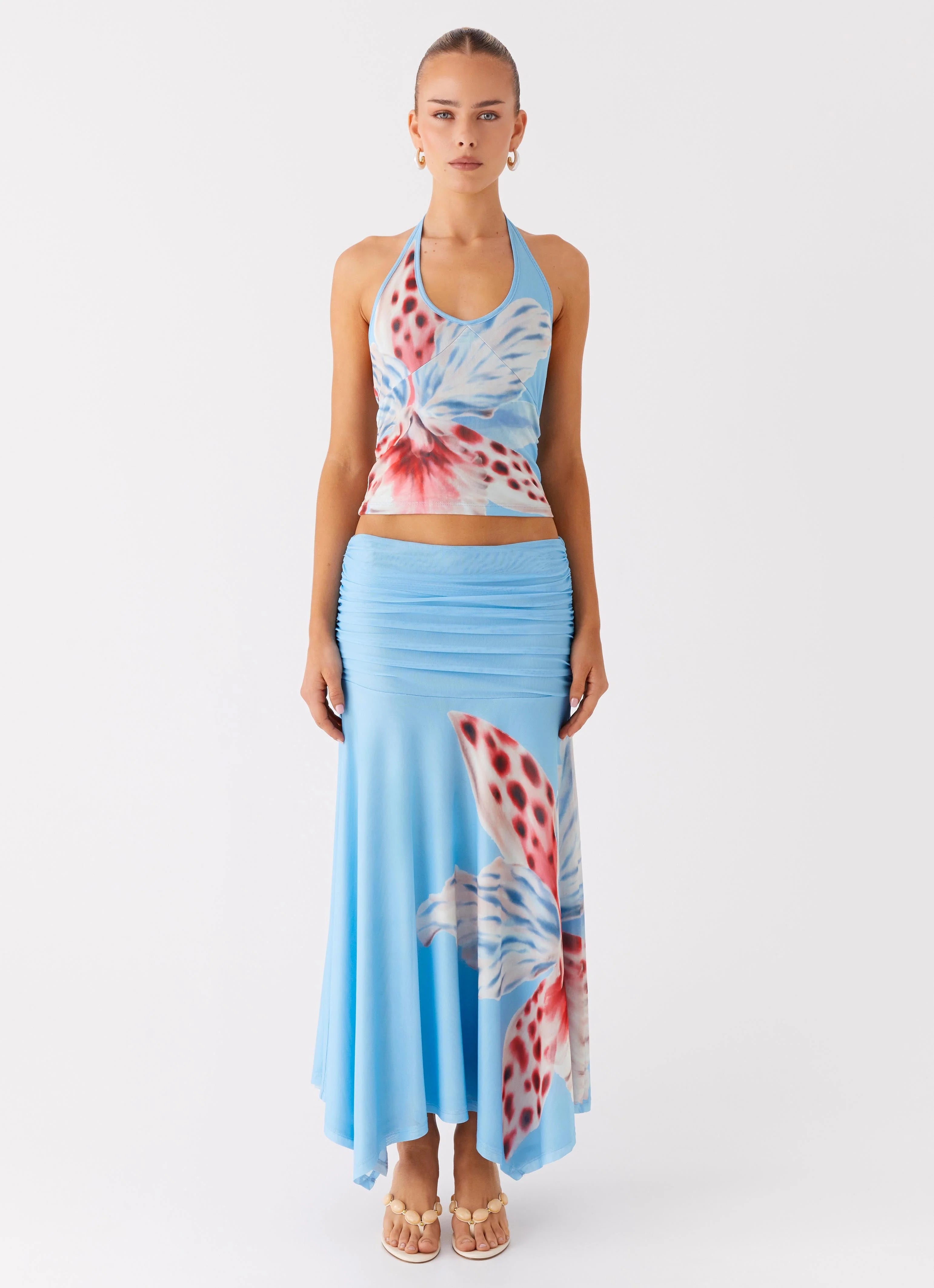The Liana Ruched Maxi Skirt is your golden ticket to endless summer styling. Sitting low on the hips, this stretch mesh silhouette features flattering side ruching and a body-skimming fit that’s perfect for beach-to-bar transitions. Designed in our exclusive print, it’s made to mix, match, and turn heads.