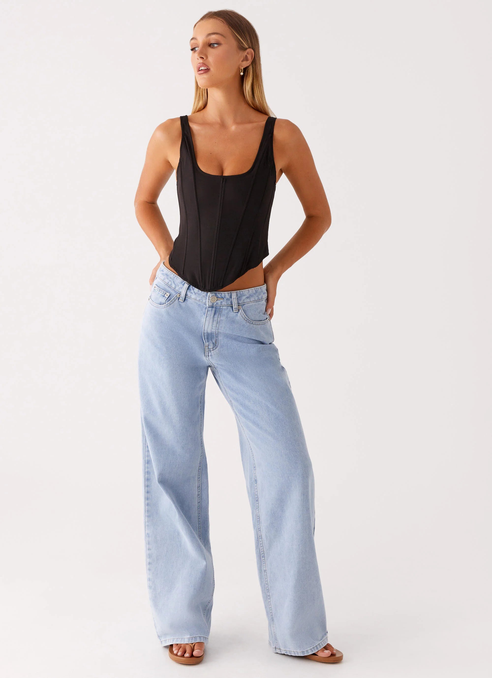 The Narelle Corset Top is a bold blend of classic charm and contemporary edge. Featuring a curved hem and front bow detail, it adds a touch of playful elegance to your look.