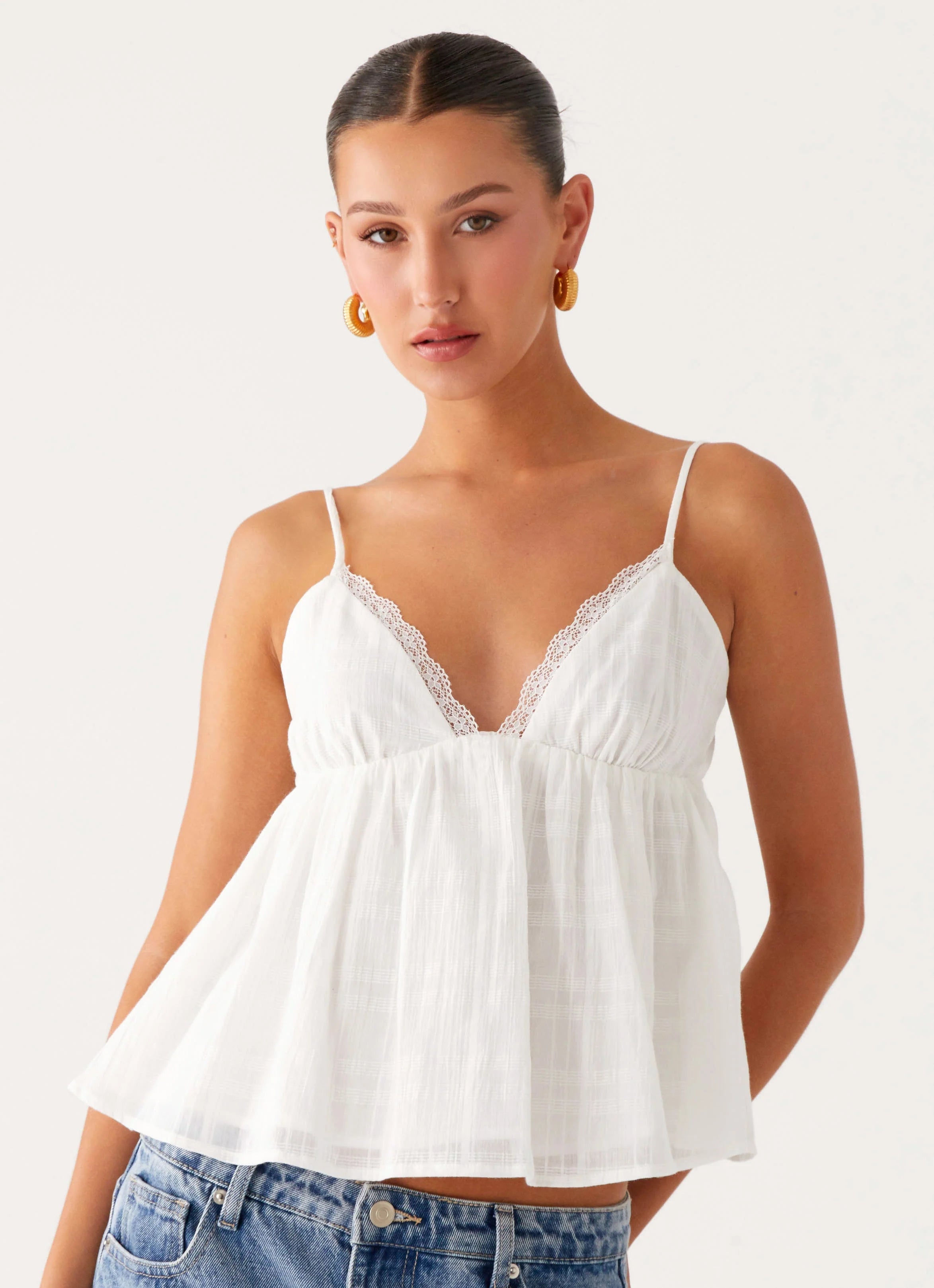 The Obliviate Cami Top is a dreamy staple crafted from textured cotton with delicate lace trims. Featuring a halter neckline with a plunging V front, adjustable back strap, and low-back finish, this piece is perfect for pairing with your fave denim or a flirty mini skirt.
