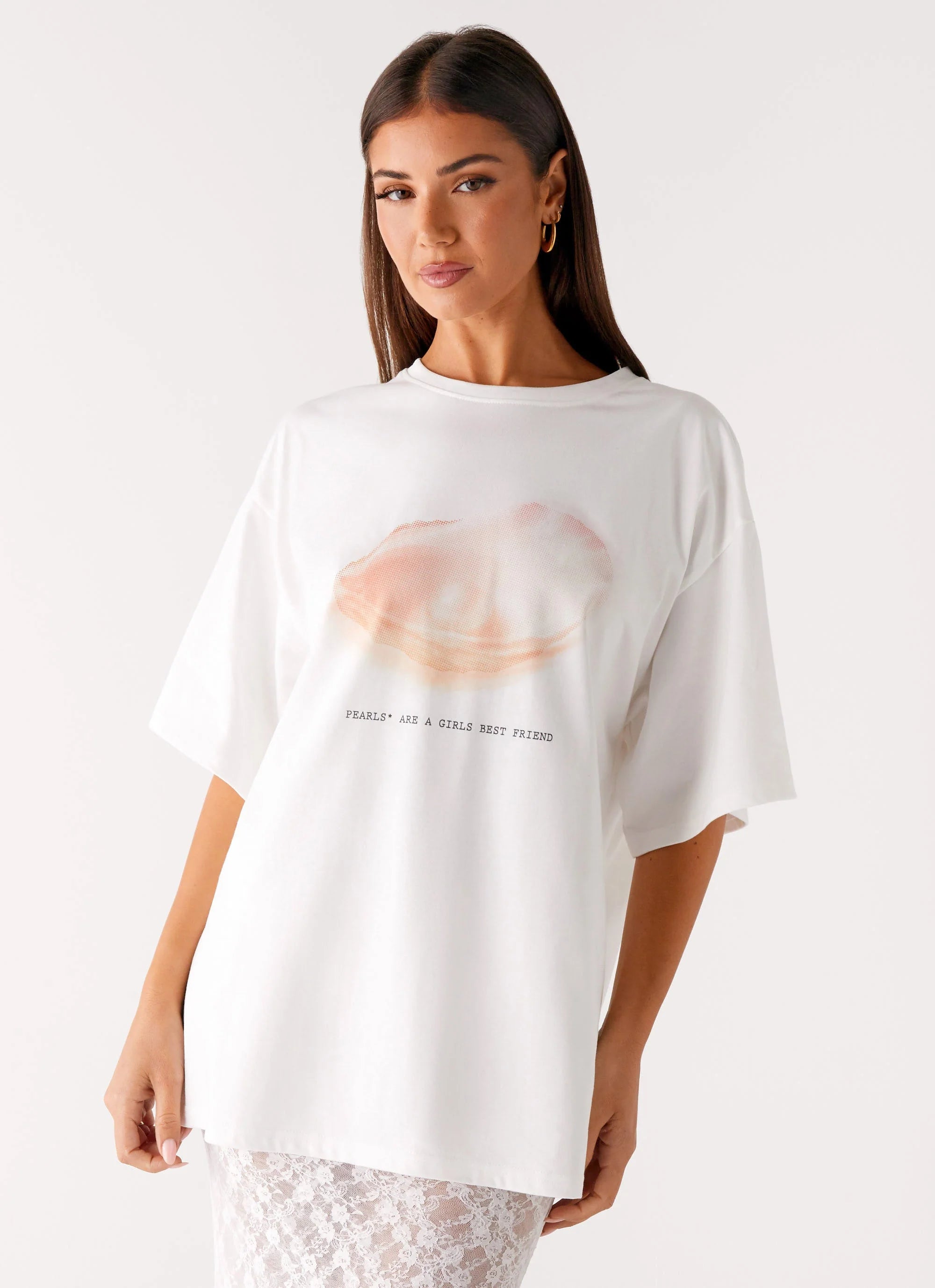 Effortlessly cool and laid-back, the Pearl Oversized Tee in White is your go-to for relaxed style. With a rounded neckline, oversized fit, and ribbed detail, it’s perfect for those days that start casual and turn unforgettable.