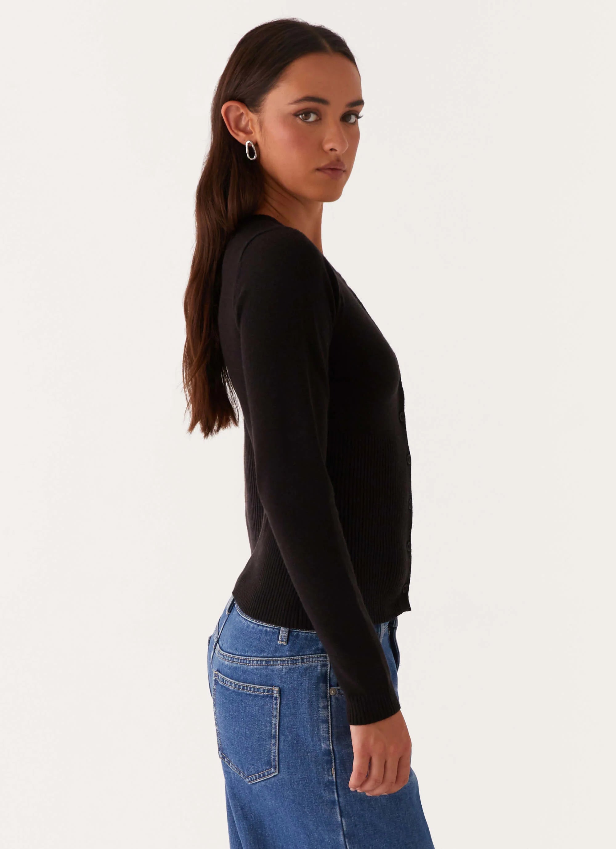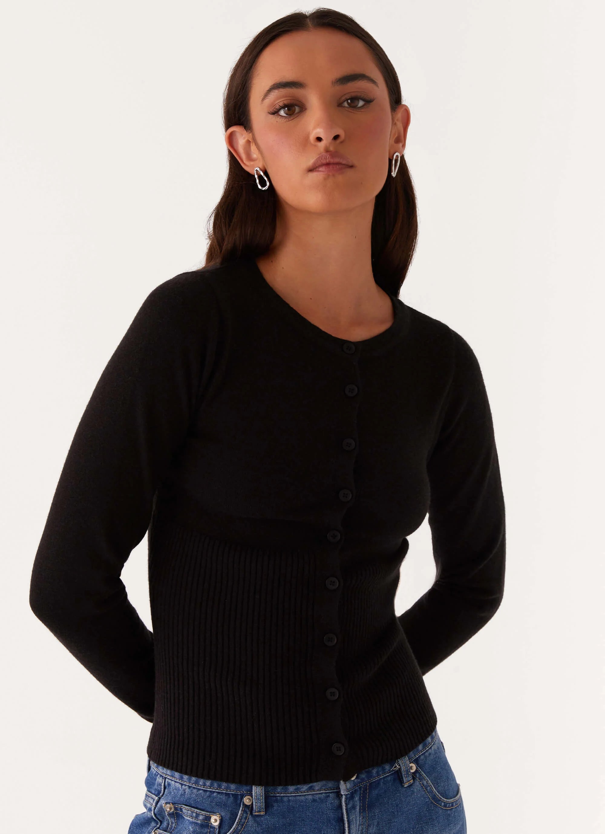 The Reagan Knit Top features front buttons for a chic touch and is crafted from a comfortable stretch knit. Its unlined design ensures a lightweight feel, making it a versatile piece for layering or wearing on its own.